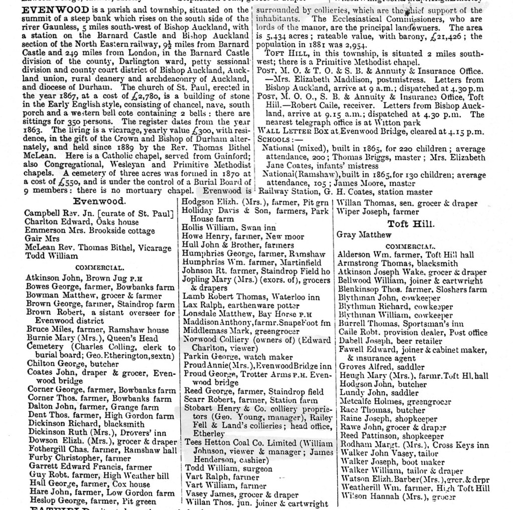 1890 Kelly’s Directory provides detail about the village and commercial enterprises. In 1881, the population of Evenwood and the Barony was 2,954.