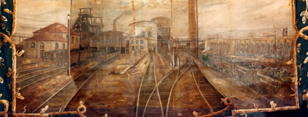 Below: An image from the Durham Miners Association Randolph Lodge banner. The banner was officially unfurled June 1909. It shows the 2 colliery shafts, the coal screens, the rail yard for incoming and outgoing trucks and to the right, the coppee coke ovens with coke resting on the bench being loaded into the coke trucks below.