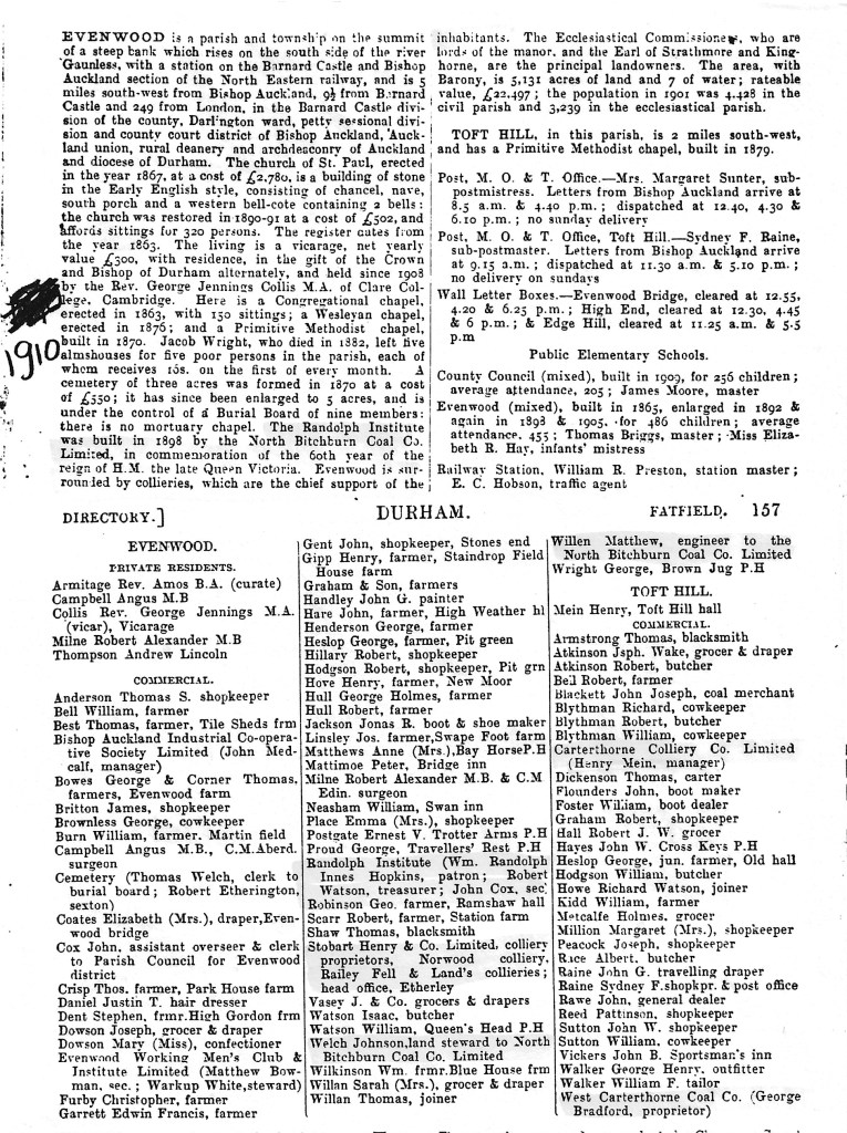 1910 KELLY’S DIRECTORY 1910 Kelly’s Directory informs that the population of Evenwood & Barony was 3,239.