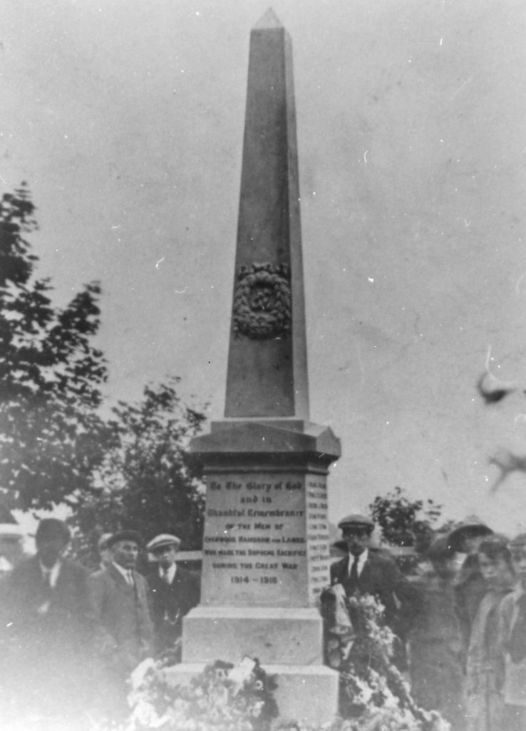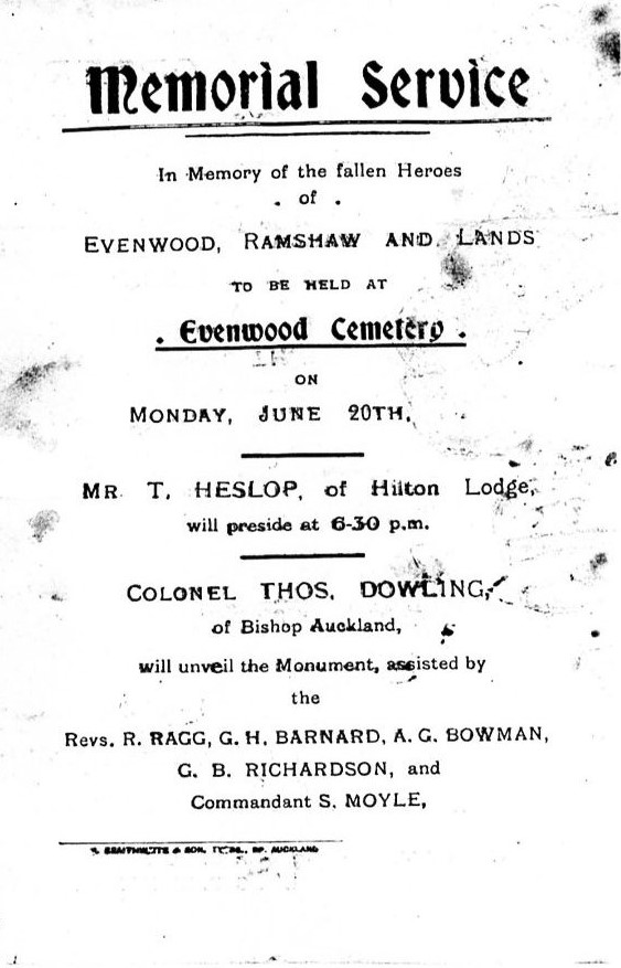 Monday 20 June 1921: the memorial to the men of Evenwood, Ramshaw and Lands was unveiled by Colonel Dowling. Mr. T. Heslop, former manager of Randolph Colliery and agent to the North Bitchburn Coal Company, was chairman of the organising committee. Designed, executed and erected by William Allison & Sons sculptors, Bishop Auckland. Proceedings commenced with a procession which was formed at the top end of Evenwood village consisting of ex-soldiers and sailors, Girl Guides and Boy Scouts headed by the Village Band. A vast crowd assembled and heard the Evenwood Band performing an appropriate selection of hymns and anthems. The Last Post was sounded.