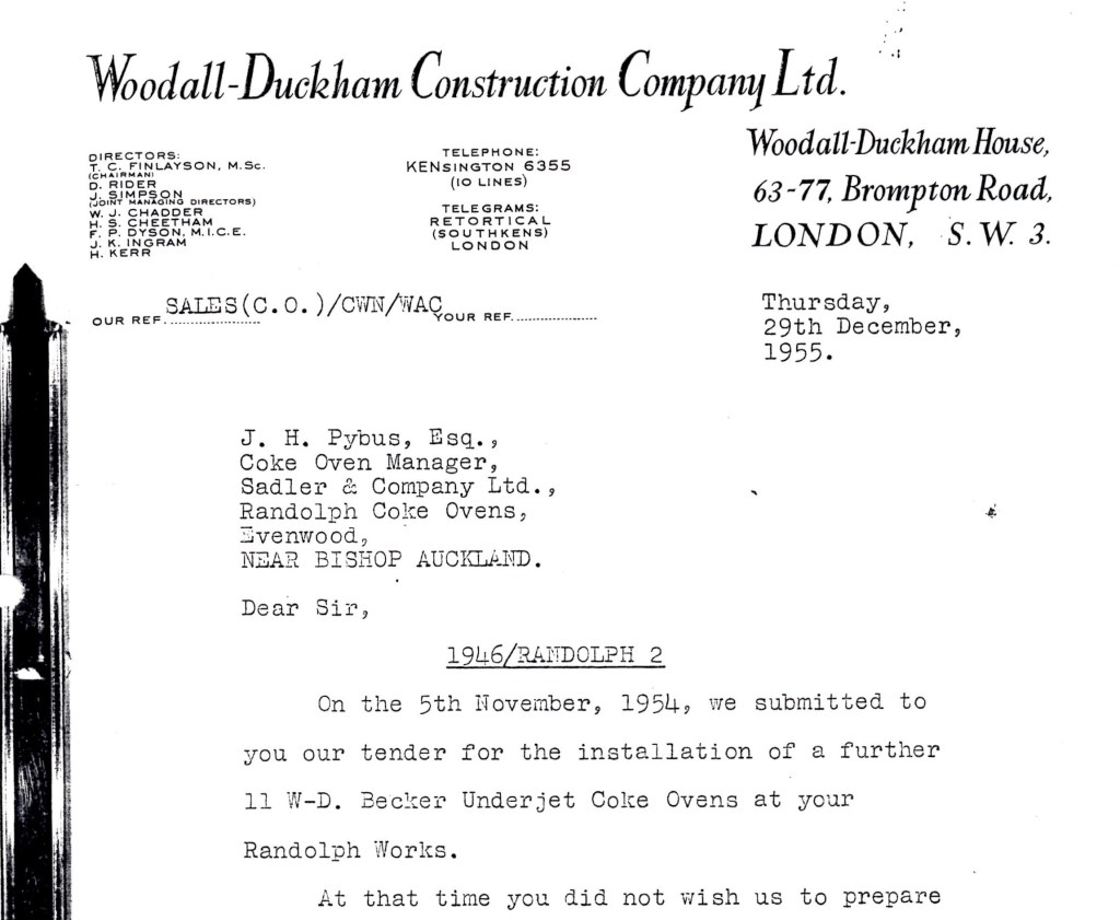 1954: an estimate was submitted for a further 11 W-D Becker underjet coke ovens for Randolph coke works (Sadler & Company Ltd).