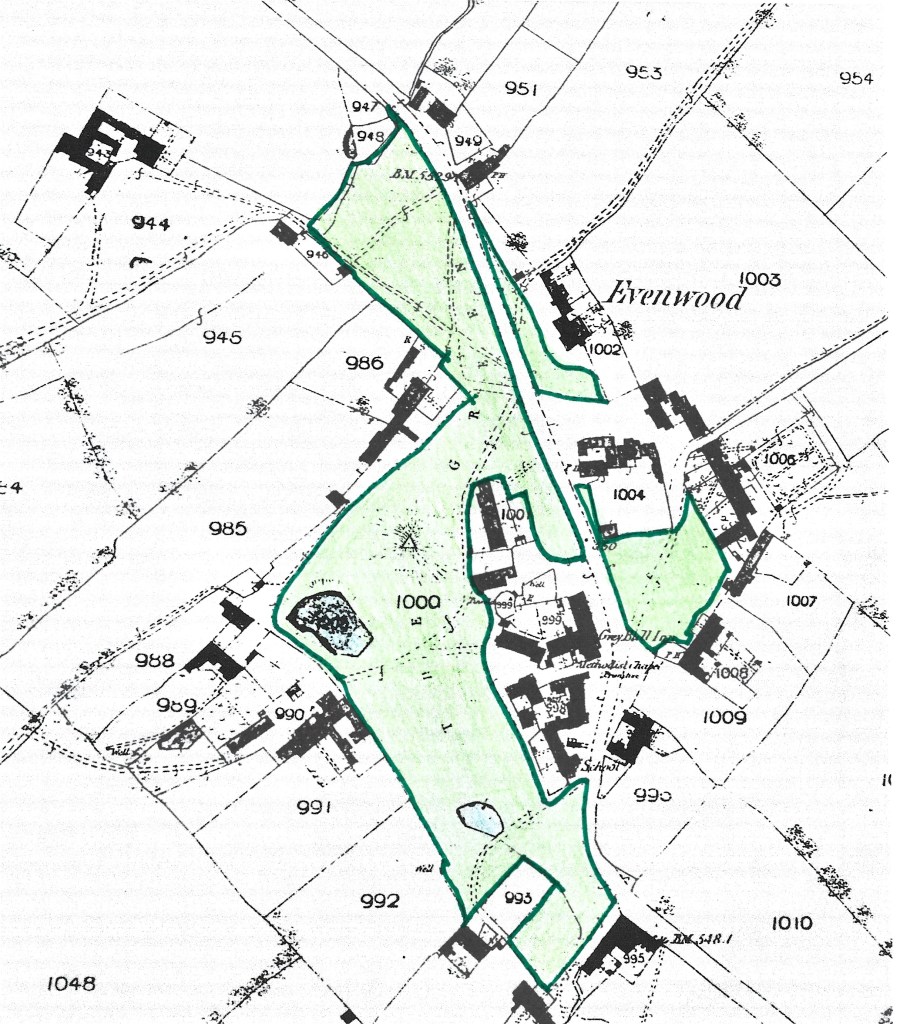 The 3 maps which follow show the centre of Evenwood, particularly around the green, in relation to housing and industry as mentioned by Ian Nairn in the above article. They are not intended to show any land ownership or have any legal basis. Areas have been edged and coloured simply to show the extent of the grassed areas within the centre of Evenwood. The third map shows the defined area of the “registered village green.”