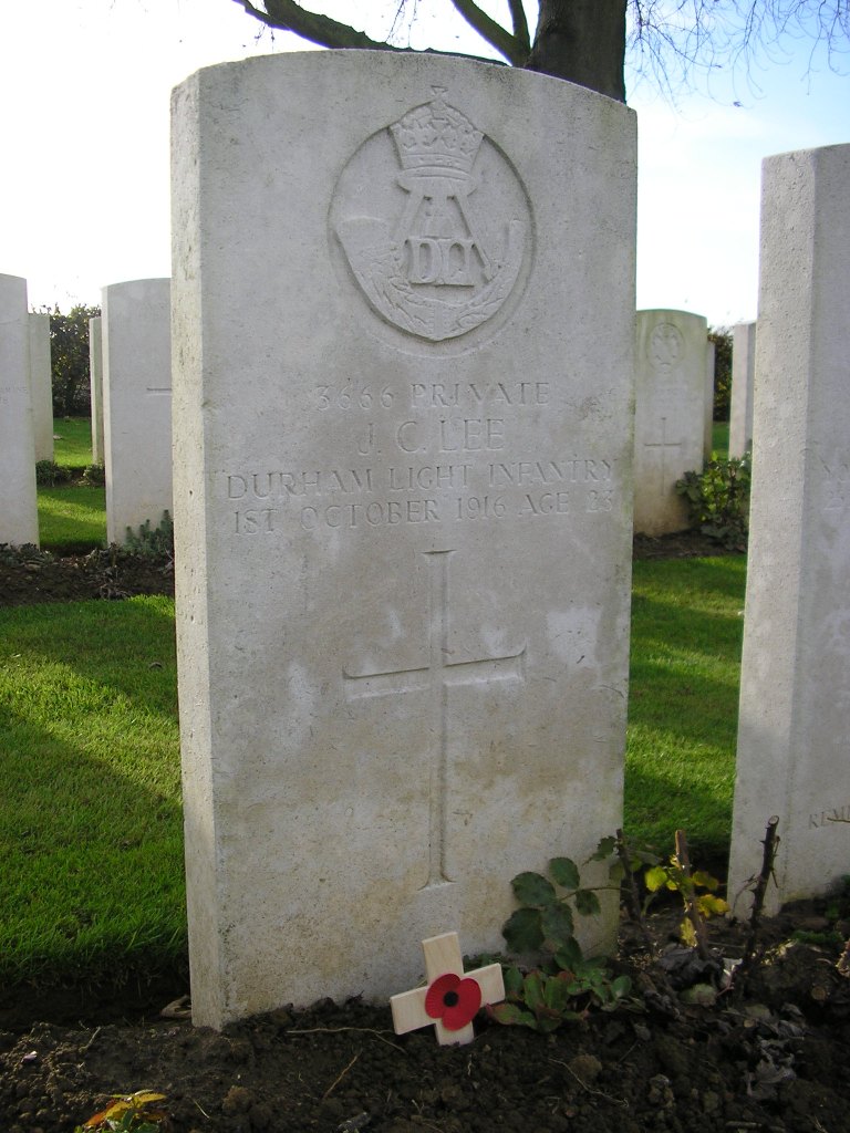 3666 Private Jeremiah Cameron Lee, is buried at grave reference VIII.J.12 Warlencourt British Cemetery, France and commemorated on Cockfield War Memorial. He was 23 years old and married to Mary Jane and lived at Evenwood.[16] Jeremiah “Jerry” Cameron was born c.1893[17] at Cockfield to John and Elizabeth. There were at least 6 children: