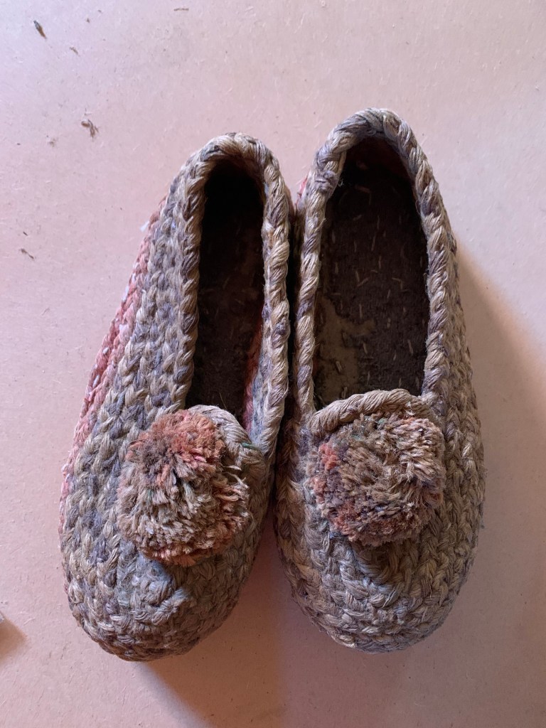 One artefact was a great surprise – a pair of slippers decorated with pom-poms, made from sacking material. Ena takes up the story:
