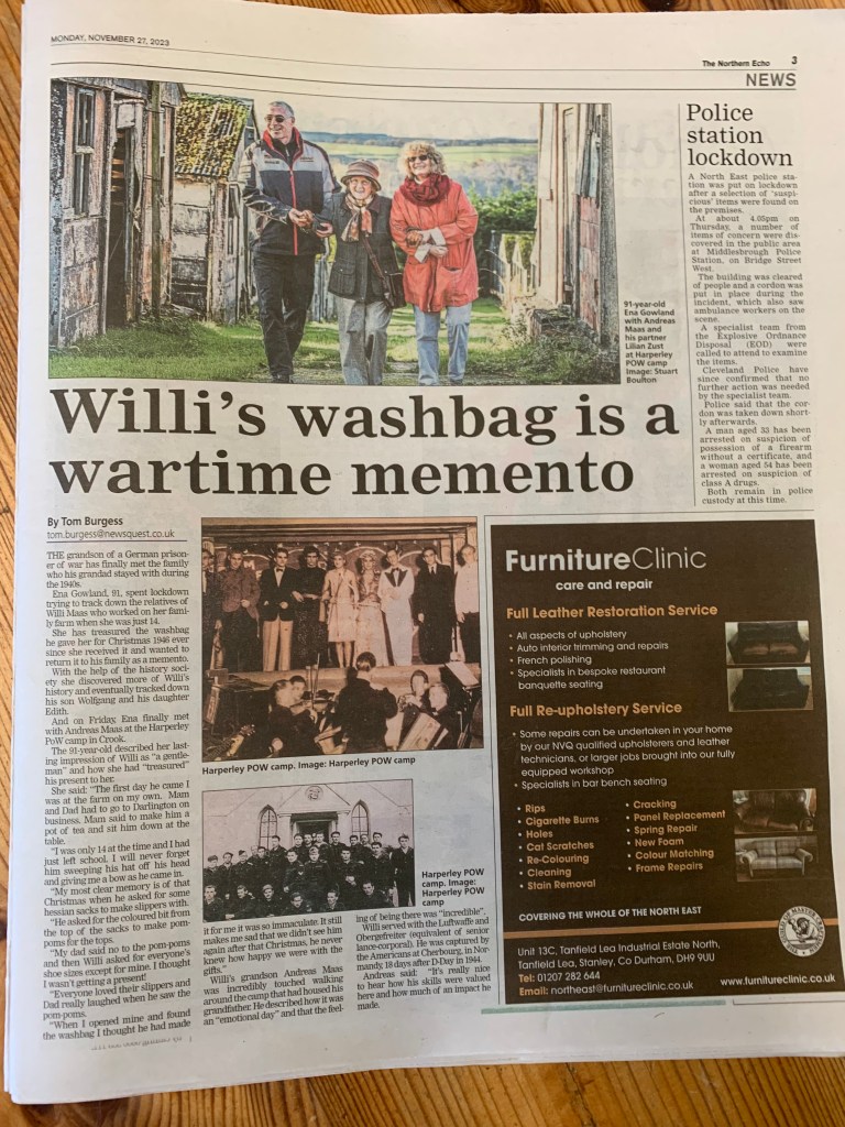 Ena Gowland was delighted to welcome Andreas Maas to Spring Gardens last week. Andreas is the grandson of Willi Maass, the German POW who worked at Ena’s father’s farm, back in 1946. A toiletry bag, given to Ena as a Christmas present by Willi, was returned to the Maass family in September 2020.