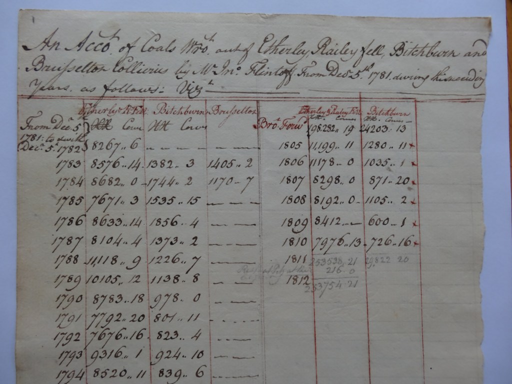 Above: Details of Accounts 1782-1810 from the legal agreements for Etherley, Railey Fell, Bitchburn & Brusselton Collieries[10]
