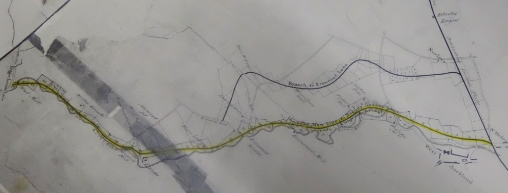 1823: With specific reference to the Haggerleases Branch, a plan deposited to John Dunn, the Deputy Clerk of the Peace for the County of Durham on the 7th September 1823 was surveyed by John Dixon. He was the grandson of George Dixon (1713-1785) who was associated with Brindley’s canal.[21] Robert Stephenson, son of George, was the Engineer.[22] This plan shows the old branch line from Norlees to Evenwood Lane (the Overton line) and the proposed new route to Haggerleases Lane which followed the River Gaunless, along the valley.