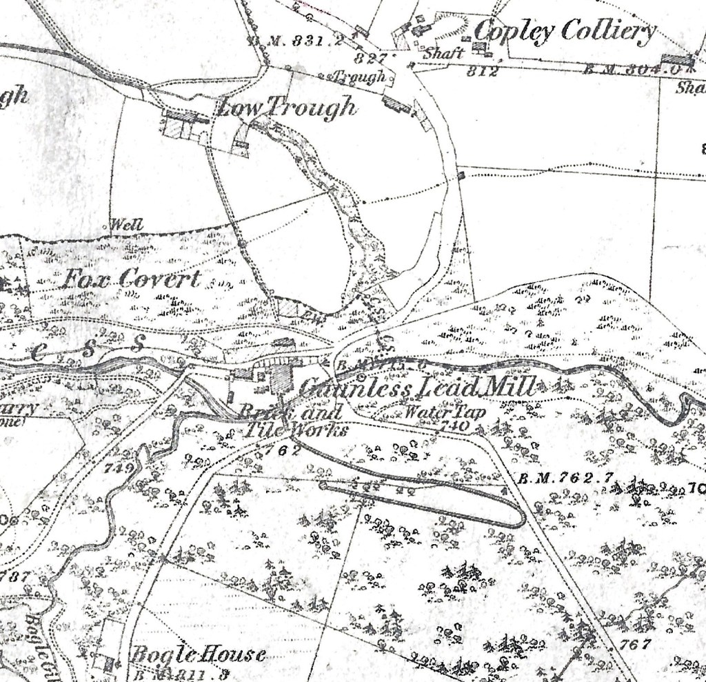 The 1859 OS map names a brick and tile works to the south of Copley Colliery. The prime manufacturing process at the site was a lead smelting mill. An impressive chimney remains to this day which is constructed with a stone outer skin and brick inner. The OS map indicates a track (or is it a flue) connecting the brick and tile works to the chimney. Was this a brick works? Perhaps the works was established to provide bricks for the chimney?