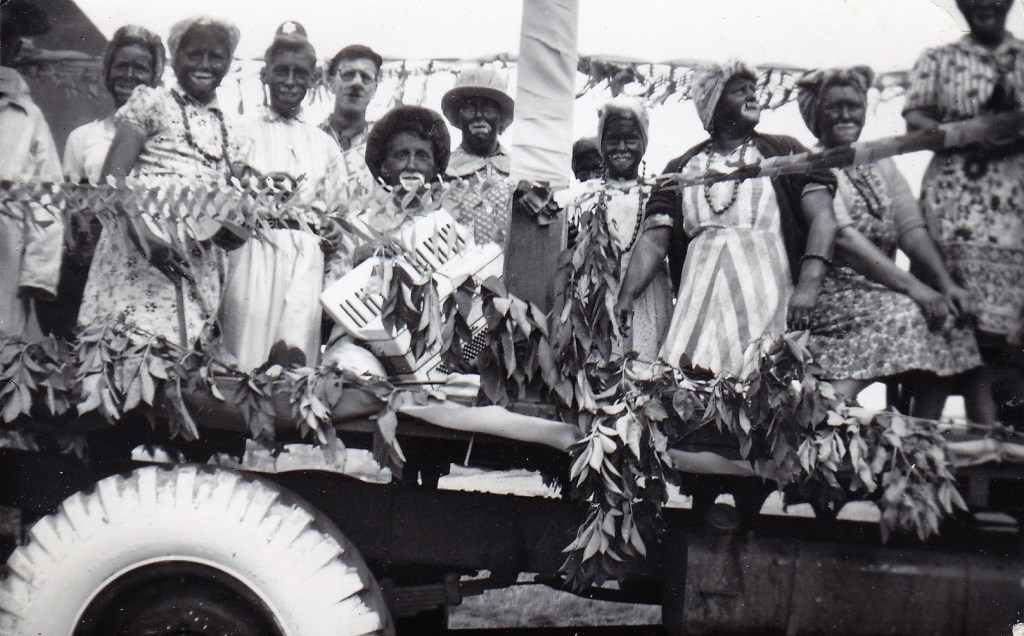 Below: 1920’s?: Carnival float passing Ramshaw School and the Ford, Oaks Bank