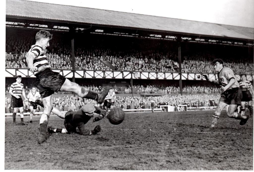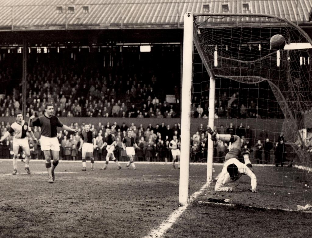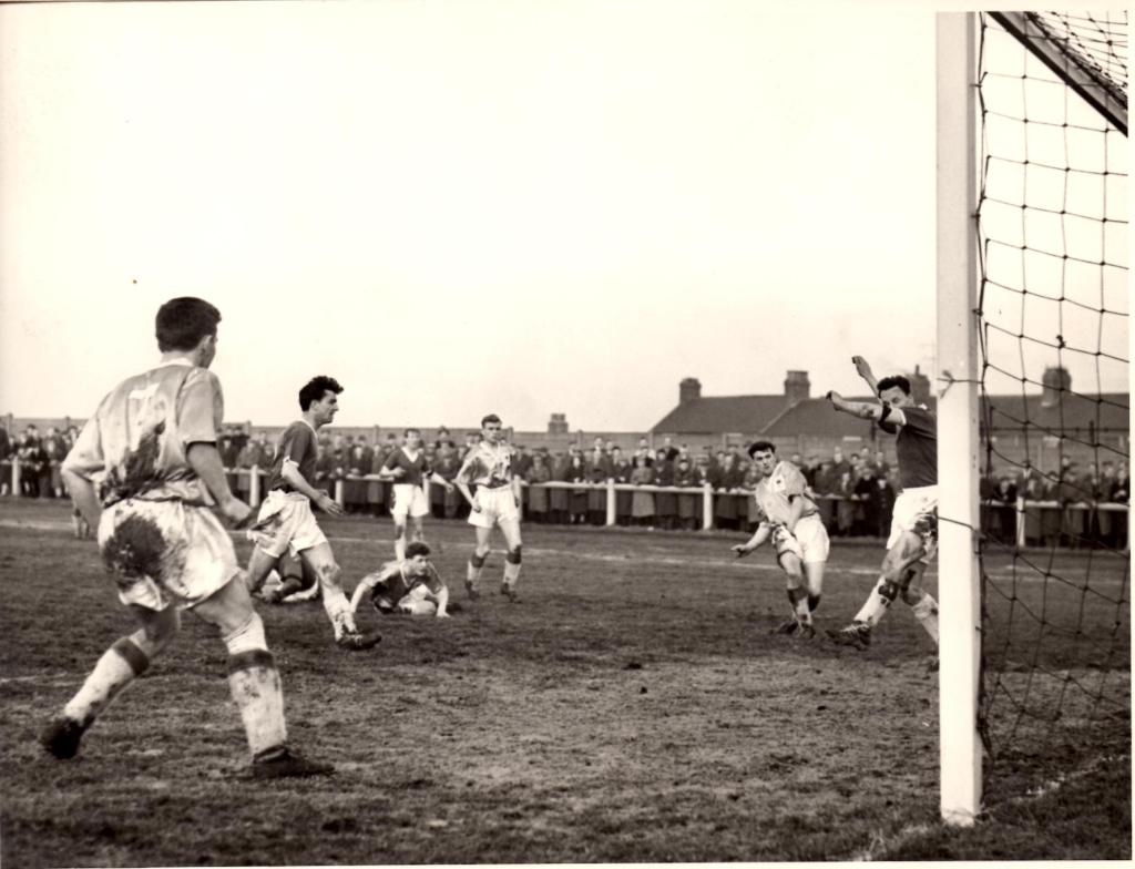 Cyril Gowland, half back, scores for West with a free kick, beating Bishop Auckland’s legendary goalie, Harry Sharratt.