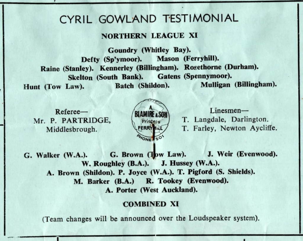 Cyril Gowland was always going to be a footballer, enjoying his schoolboy games at Cockfield. He played for his local team Cockfield then West Auckland and Evenwood Town, and for the top Northern League teams of the 1950’s, Bishop Auckland and Crook Town, before returning to West. This tribute will provide some team photos and action shots from his career, courtesy of Johnny Weir.