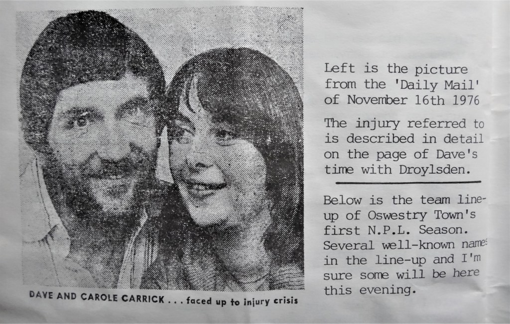 A spell with Cheshire County League side Stalybridge Celtic followed before Witton Albion’s manager Ken Barnes snapped him up for the 1969/70 season. David enjoyed 4 successful seasons, from 1969 to 1973, making 235 appearances, scoring 98 goals for the Nantwich side. During the 1970/71 season, he was invited for trails at Manchester City but didn’t get offered a contract so returned to Witton Albion. While at Manchester City, David met his future wife, Carole, where it is understood that she was manager, Joe Mercer’s secretary.