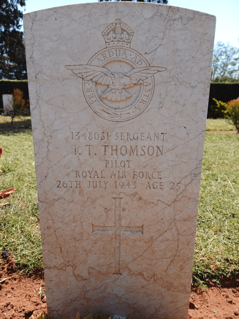 1348081 Sergeant U/T Pilot William Arthur Dent, buried at grave 108, Harare [Pioneer] Cemetery, Zimbabwe. Sergeant I.T. Thomson and is buried next to him. There are 224 Commonwealth burials of WW2.
