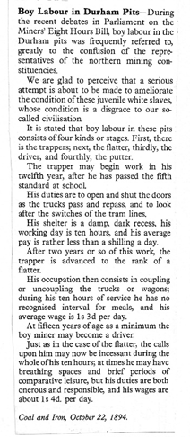 1894: The Miners’ Eight Hours Bill was introduced in Parliament. An article from the “Coal and Iron” magazine 22 October 1894, describes the work of boys in the Durham pits.