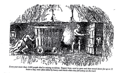 Even though reduced hours were won, young trapper boys, tending the ventilation doors, would still sit in the dark for 12 hours or more. Not until the Coal Mines Act of 1842 was underground employment of women and children under the age of 10 prohibited.