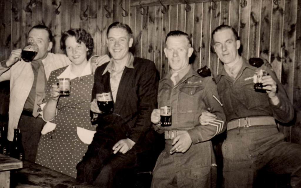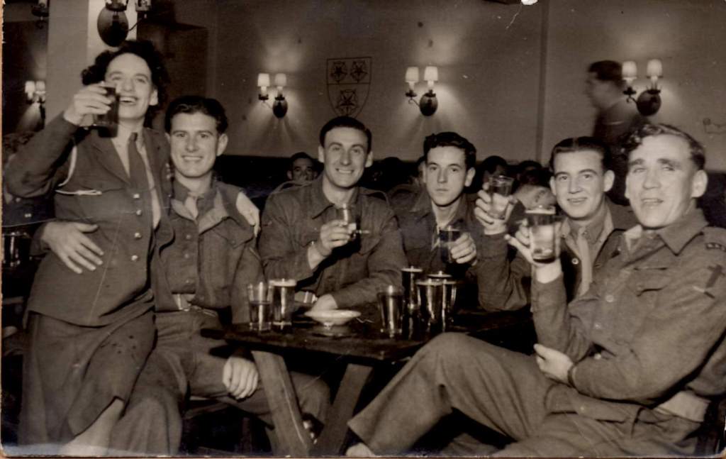 - Above: 1945: Brussels, another from the 21 Club, Peggy possibly showing the men how a lass from Crook can drink.