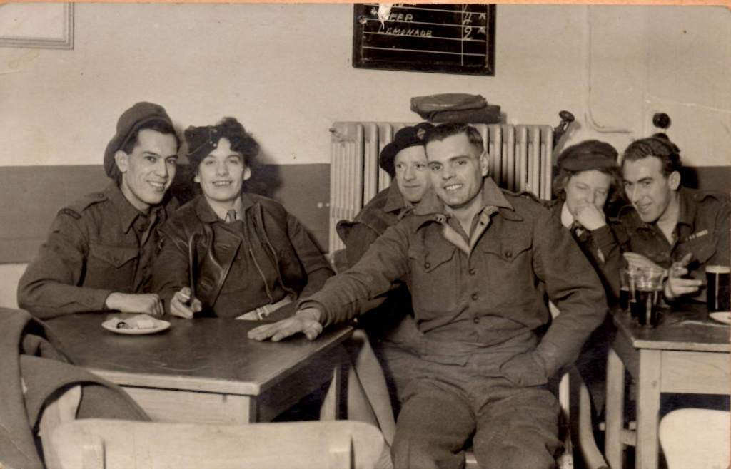 - Above: 1945: Café Blighty, Brussels. Peggy second left.