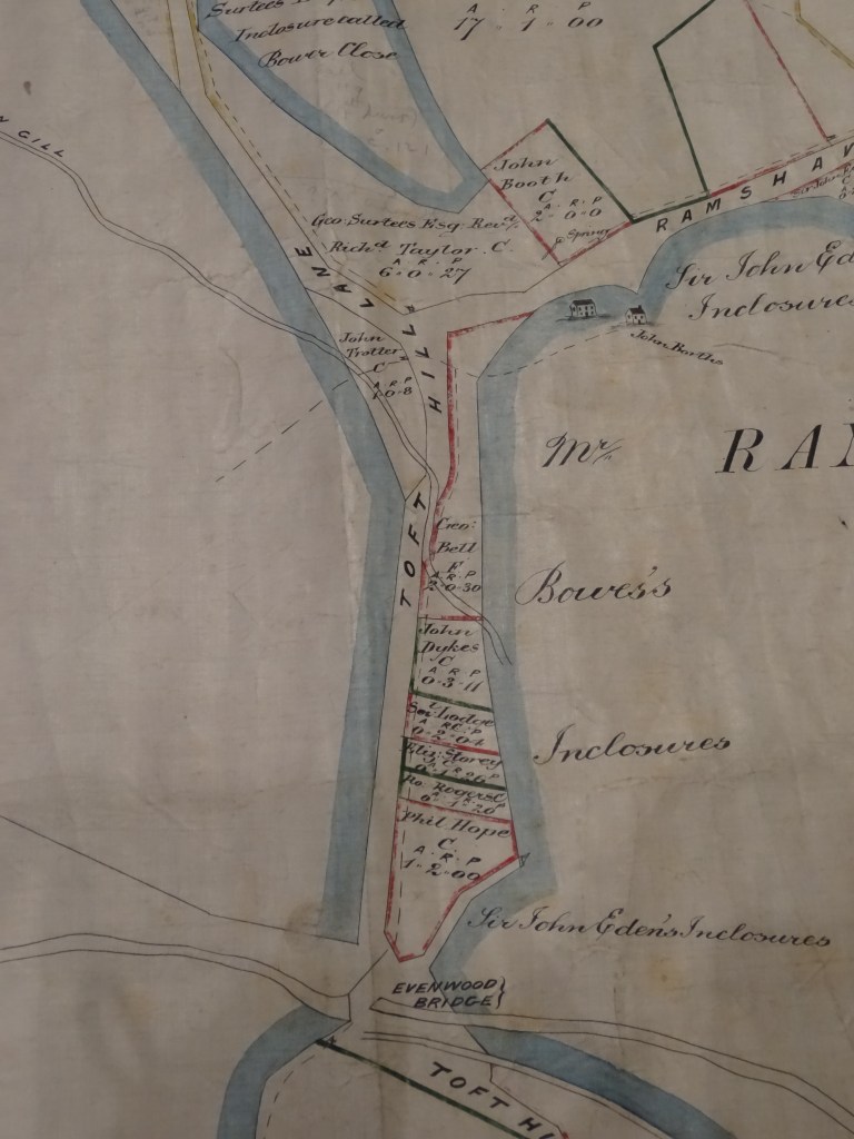 An undated plan titled, “Plan of part of the ancient enclosed lands in the Barony and Township of Evenwood in the Parish of St. Andrews Auckland Durham” illustrates in detail, land holdings. The central area of Evenwood is clearly shown with little or no development and can be identified as the village green. A pinfold is located in a central position. The farm land to the west of the green owned by Mr. William Bainbridge.
