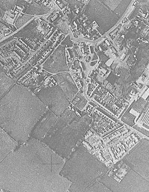 A detail from the photograph clearly shows the village green in relation to Kays Hall Farm, the fields to the west and the rest of the village.