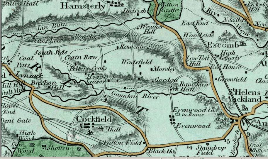Evenwood is indicated together with the notation, “Evenwood Castle in ruins”. There is a small illustration which gives the impression of a substantial building. This is the first evidence we have found to date which indicates “Evenwood Castle”