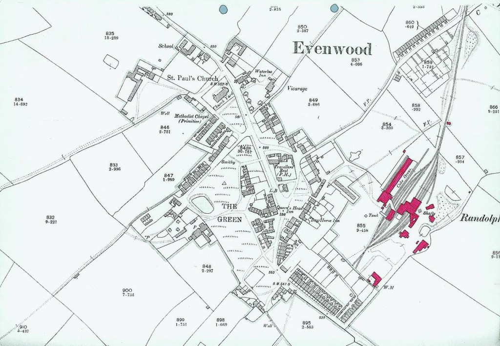 Additions are clearly shown, notably the school, St. Paul’s Church, Randolph Colliery and housing. The new Anglican church occupies land to the north of the village green. A smithy was located in South View, the terrace of houses to the north of the Green. There was a pond.