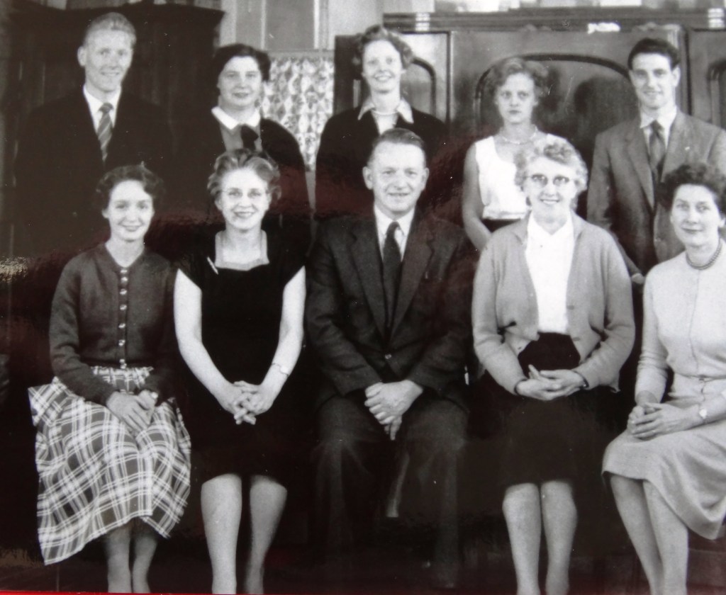 Below: Bill Johnson (Head) bottom right, with his staff, Mrs. Waistell, John Bowron and Ray Angus at the back, Mrs. Brown next to Mr. Johnson.