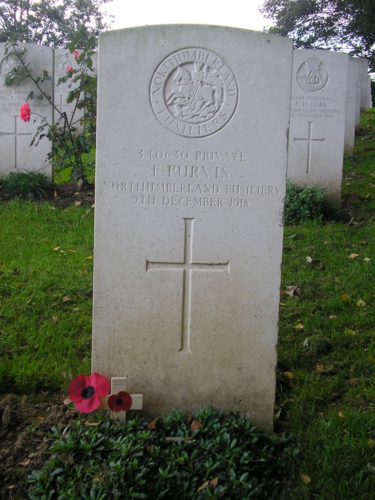 340630 Private Fred Purvis, 1/5th battalion, the Northumberland Fusiliers died 9 December 1918 and is buried at Niederzwehren Cemetery near Kassel, Hessen, Germany.[1] He was about 24 years old and is commemorated on Evenwood War Memorial and the Roll of Honour, St. Paul’s Church, Evenwood.