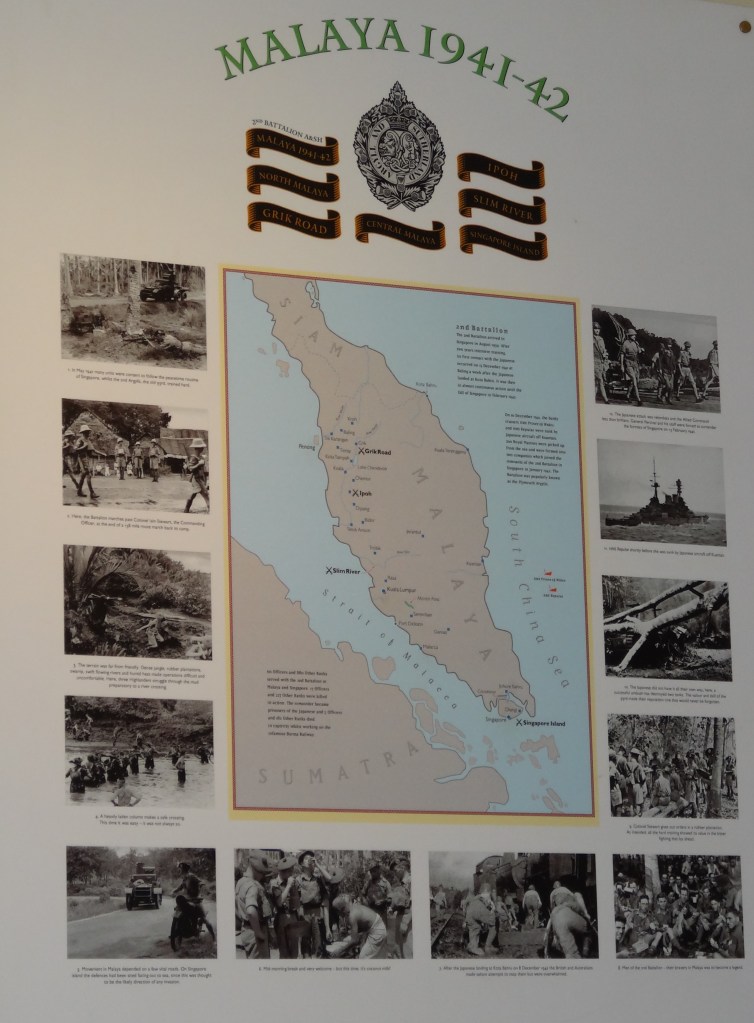 When war broke out, the 2nd Battalion was in Malaya and valiantly fought the Japanese down the length of Malaya. They were one of the very few British units that were prepared for the jungle warfare. During the withdrawal of the Indian 11th Infantry Division, the 2nd Argylls slowed the enemy advance and inflicted heavy casualties on them. The battalion held the Causeway into Singapore and fought a strong rear guard action during the retreat down the west coast of Malaysia. They suffered many casualties and the battalion was practically destroyed during the Battle of Slim River. The survivors were sent back to Singapore where they were amalgamated with the Royal Marine survivors from HMS Prince of Wales and HMS Repulse. They took part in the final battles for the island of Singapore before surrendering 15 February 1942 with the rest of General Percival’s army to become Prisoners of War. Many died in captivity or in the jungle trying to avoid capture.