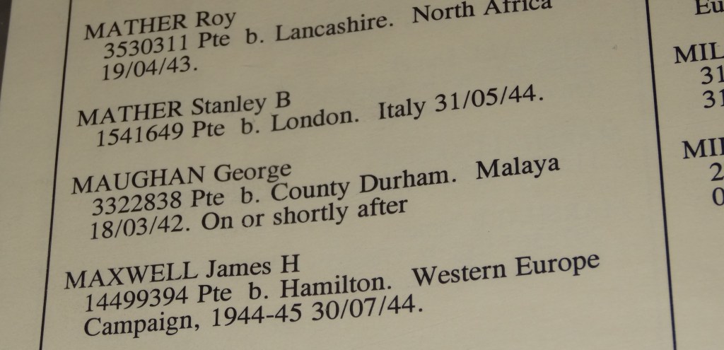 The Argyll & Sutherland Highlanders Museum has been visited and staff showed us exhibits, personal diaries and accounts, most interestingly, the Record Book of QMS Aitken.[6] Private G. Maughan served in “A” Company and he was noted as “Missing” on the 13 January 1942 and the Roll of Honour records “on or around 18 March 1942”.