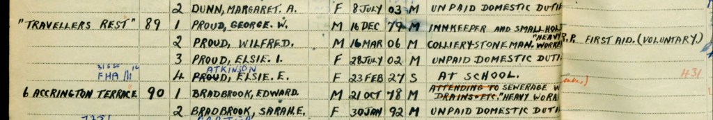 1939: George Wilfred Proud was recorded as an, “innkeeper and small holder” at the Travellers Rest. Living there was his son Wilfred, born 16 March 1906, who worked as a colliery stoneman and (presumably) his daughter Elsie Proud, born 28 July 1902 and (presumably) their granddaughter Elsie, born 23 February 1927.