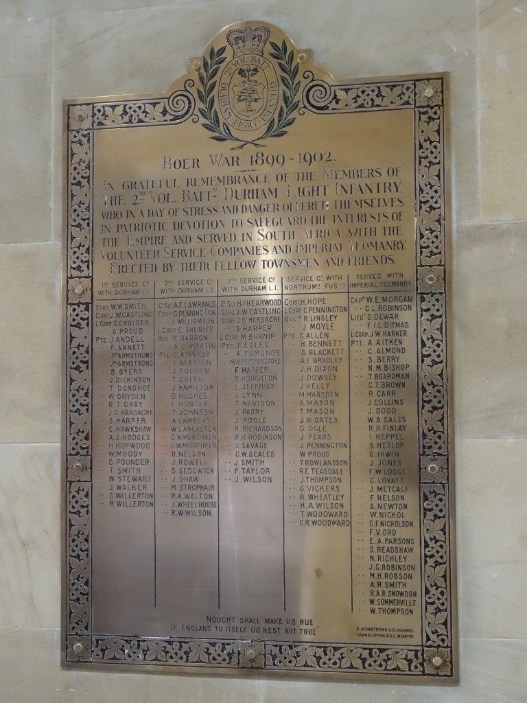In grateful remembrance of the members of the 2nd Vol. Battn. Durham Light Infantry who in a day of stress and danger offered themselves in patriotic devotion to safeguard the interests of the Empire and served in South Africa with the Volunteer Service Companies and Imperial Yeomanry.
