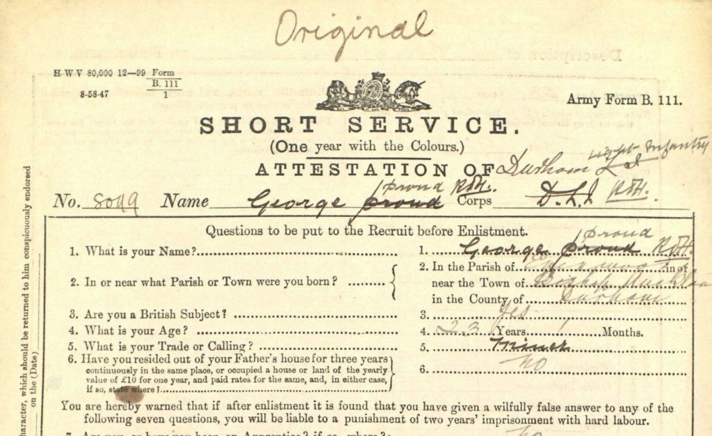 25 January 1900: George Proud aged 23 years 1 month, signed the attestation form which records the following details.