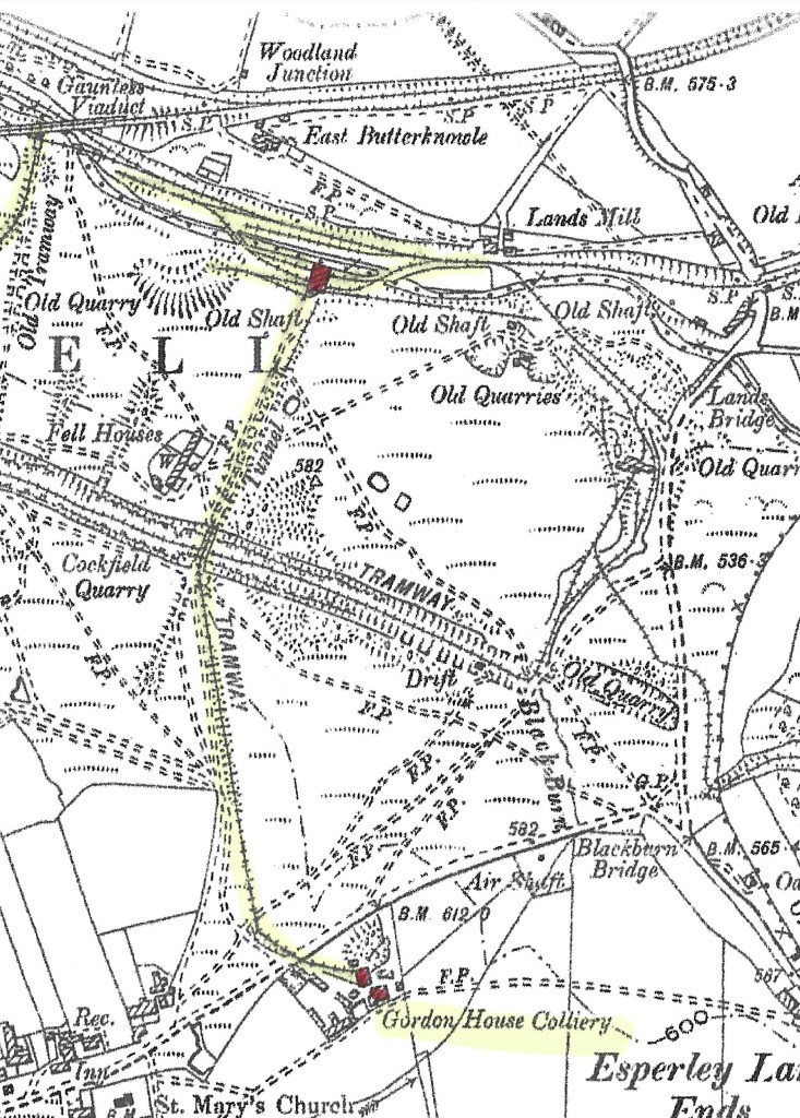 Above: 1898 OS map showing Gordon House Colliery and the tramway leading northwards over Cockfield Fell