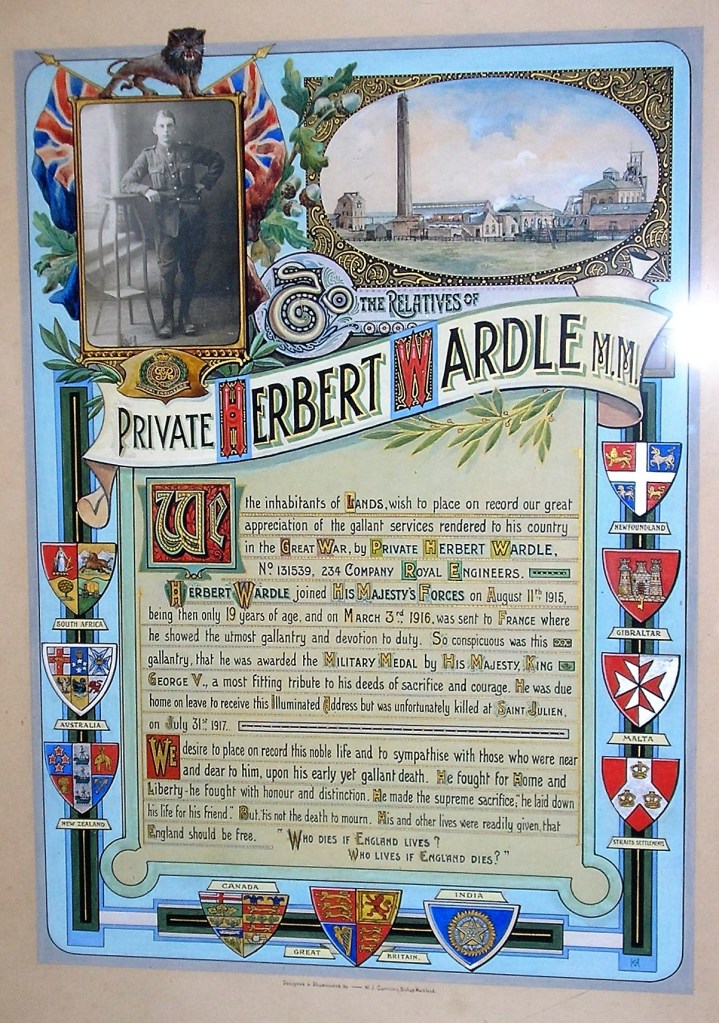 We the inhabitants of Lands wish to place on record our great appreciation of the gallant services rendered to his country in the Great War by Private Herbert Wardle. No. 131539, 234 Company Royal Engineers.