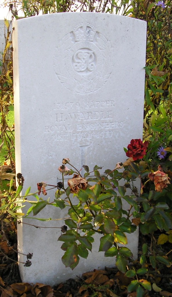 Sapper H. Wardle is buried at grave reference XIV F 7 New Irish Farm Cemetery. The cemetery is located to the north east of Ieper, Belgium near a small country village of Zwaanhofweg. It was initially used from August to November 1917 then again in April and May 1918.