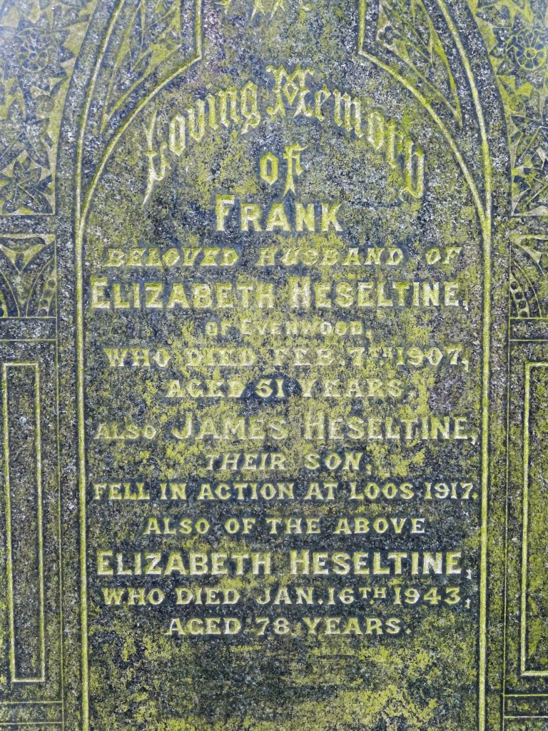 31149 Private James Heseltine, 2nd Battalion, the York and Lancaster Regiment, was killed in action 22 April 1917 and is buried at St. Patrick’s Cemetery, Loos, France.[1] He was 25 years old and is commemorated on the Evenwood War Memorial, the Roll of Honour, St. Paul’s Church, Evenwood and the Memorial Plaque in Evenwood WMC.
