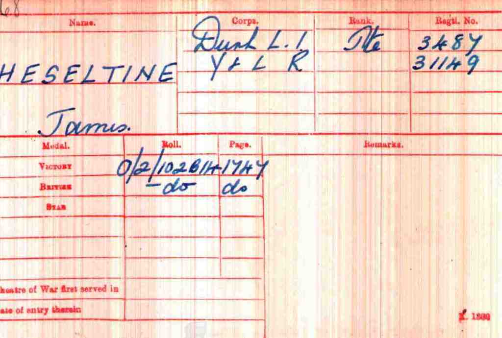 Private J. Heseltine served a total of 2 years 51 days, the last 97 days was his second tour in France.[25] He was awarded the British War and Victory medals. [26]