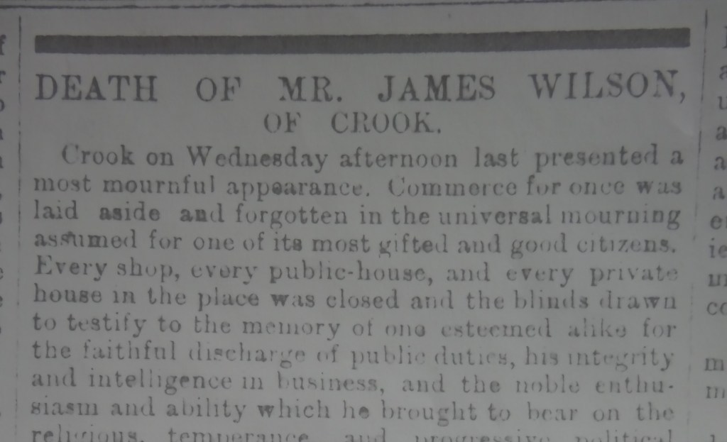 Crook on Wednesday afternoon last presented a most mournful appearance. Commerce for once was laid aside and forgotten in the universal mourning assumed for one of its most gifted and good citizens. Every shop, every public house and every private house in the place was closed and the binds drawn to testify to the memory of one of the esteemed alike for the faithful discharge of public duties, his integrity and intelligence in business and the noble enthusiasm and ability which he brought to bear on the religious, temperance and progressive political welfare of the district in which his lot was cast. For each of these movements he was sound, energetic and eloquent advocate. Few men with his opportunities, turned to such good and faithful an account the talents with which they are endowed. He was a sincere friend of all that was good and true and a staunch opponent of all vice and meanness in whatever guise he met them. With unwearied industry and unflagging zeal, he battled with and overcame great difficulties and discouragements both pecuniary and mentally and to within a few months of his death retained the full force of his varied powers. His enthusiasm and zeal in the various movements in which he was incessantly engaged never outran his discretion. He always cultivated and retained the esteem and friendly relationship of his opponents so necessary to the peace and goodwill of his neighbours and the success of the cause in which he was engaged. This was abundantly manifested at his funeral when Churchmen and Nonconformists, master and workmen, gentlemen tradesmen and publican all joined to do the honour to his memory and for once forgot their little differences and united to testify to the loss they had sustained in the death of the deceased.