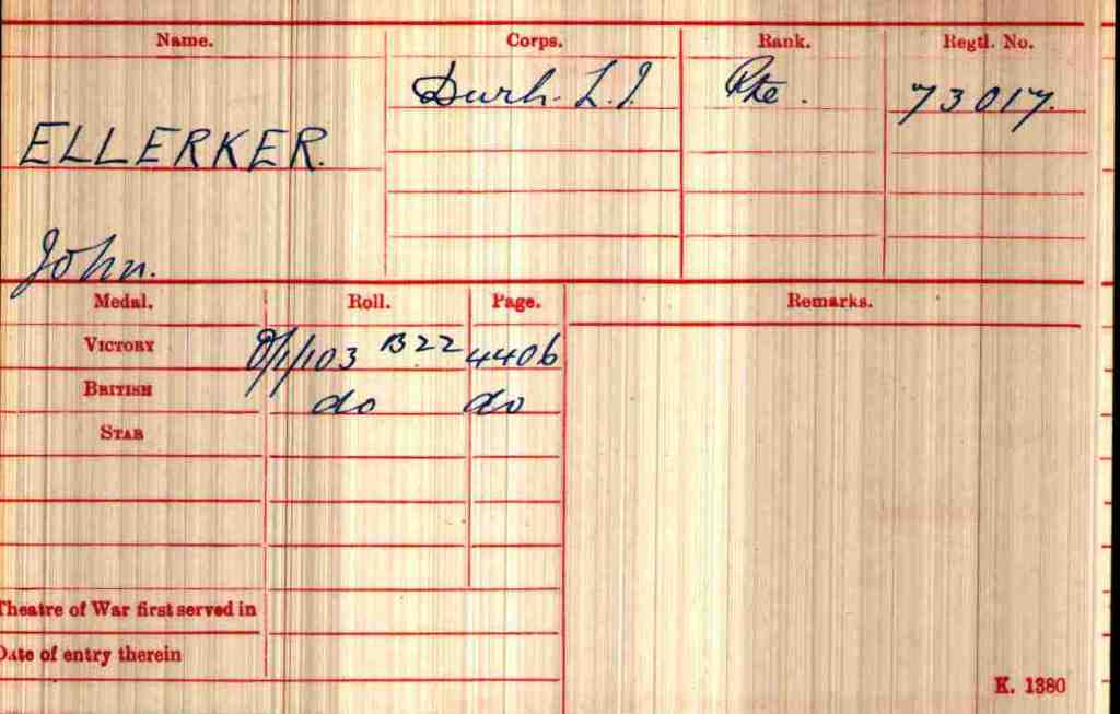 4 January 1916: John Ellerker, aged 22 years 10 months attested into the Durham Light Infantry, being given the regimental number 73017, joining the Army Reserve. At the time, he was single, worked as a coal miner and his religion was Church of England.[7]