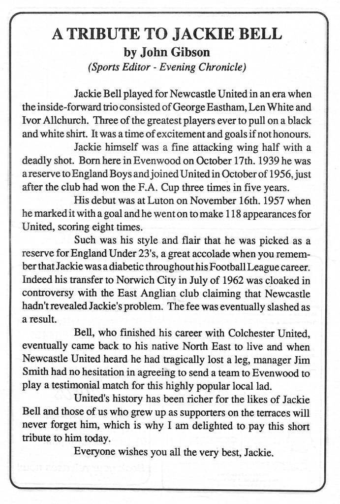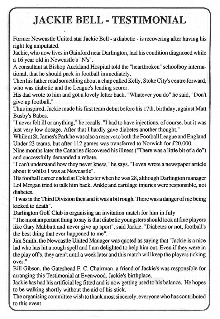 6 May 1990: Jackie Bell Testimonial Match at Evenwood: Selected details from the Match Programme
