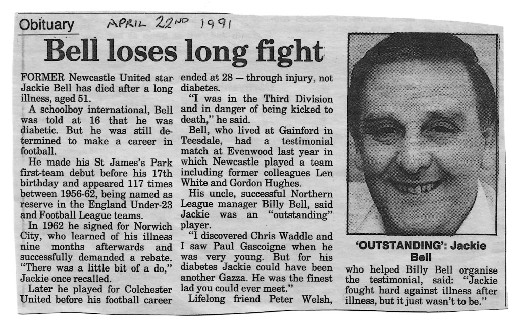 John “Jackie” Bell showed early promise, being included in the England squad for the 1955 Victory Shield Competition. He joined Newcastle United, turning professional in 1957, making 117 appearances, scoring 8 goals. In 1962, he was transferred to Norwich City and in 1965 he joined Colchester United before retiring from the game in 1966.