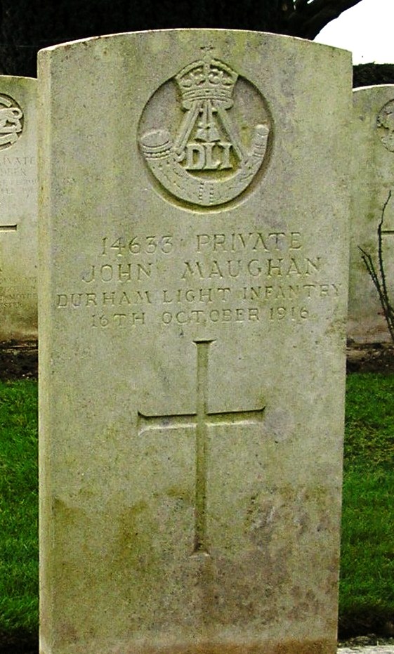14633 Private John Maughan, 14th Battalion, the Durham Light Infantry, died of wounds 16 October 1916, and is buried at Grove Town Cemetery, Meaulte, France.[1] He was 23 years old and is commemorated on the Evenwood War Memorial, the Roll of Honour, St. Paul’s Church, Evenwood and the Memorial Plaque, Evenwood WMC.