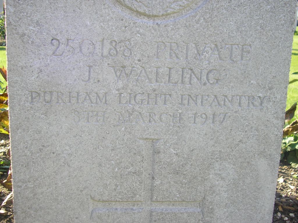 250188 Private John Walling, 1/6th Battalion, the Durham Light Infantry died of wounds 8 March 1917 is buried at St. Sever cemetery extension, Rouen, France.[1] He was 27 years old and is commemorated on the Evenwood War Memorial and the Roll of Honour, St. Paul’s Church, Evenwood.