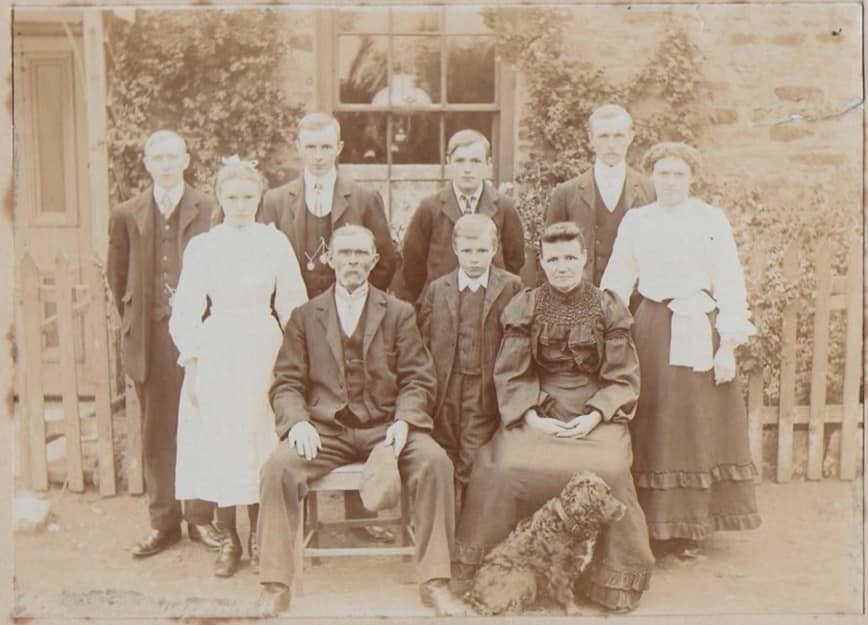 Above: The Arkless family outside Rose Cottage; back left to right: Thomas, George, Irvin, Henry; middle: Mabel, John William, Margaret; front: Benjamin & Hannah
