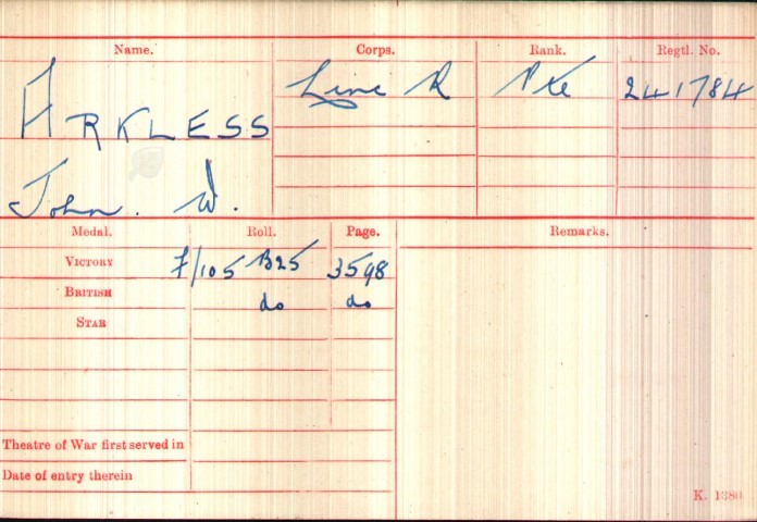Lance Corporal J.W. Arkless was awarded the British War and Victory medals.[14]