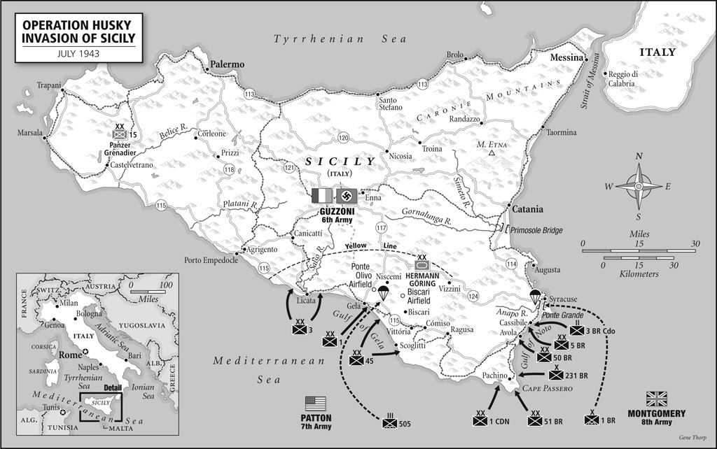 10 July: Following the successful conclusion of the North African Campaign in mid-May, a combined allied force of 160,000 Commonwealth and American troops invaded Sicily as a prelude to the assault on mainland Italy. The Italians, who would shortly make peace with the Allies and re-enter the war on their side, offered little determined resistance but German opposition was vigorous and stubborn. The campaign in Sicily came to an end on 17 August when the two allied forces came together at Messina but failed to cut off the retreating Axis lines.