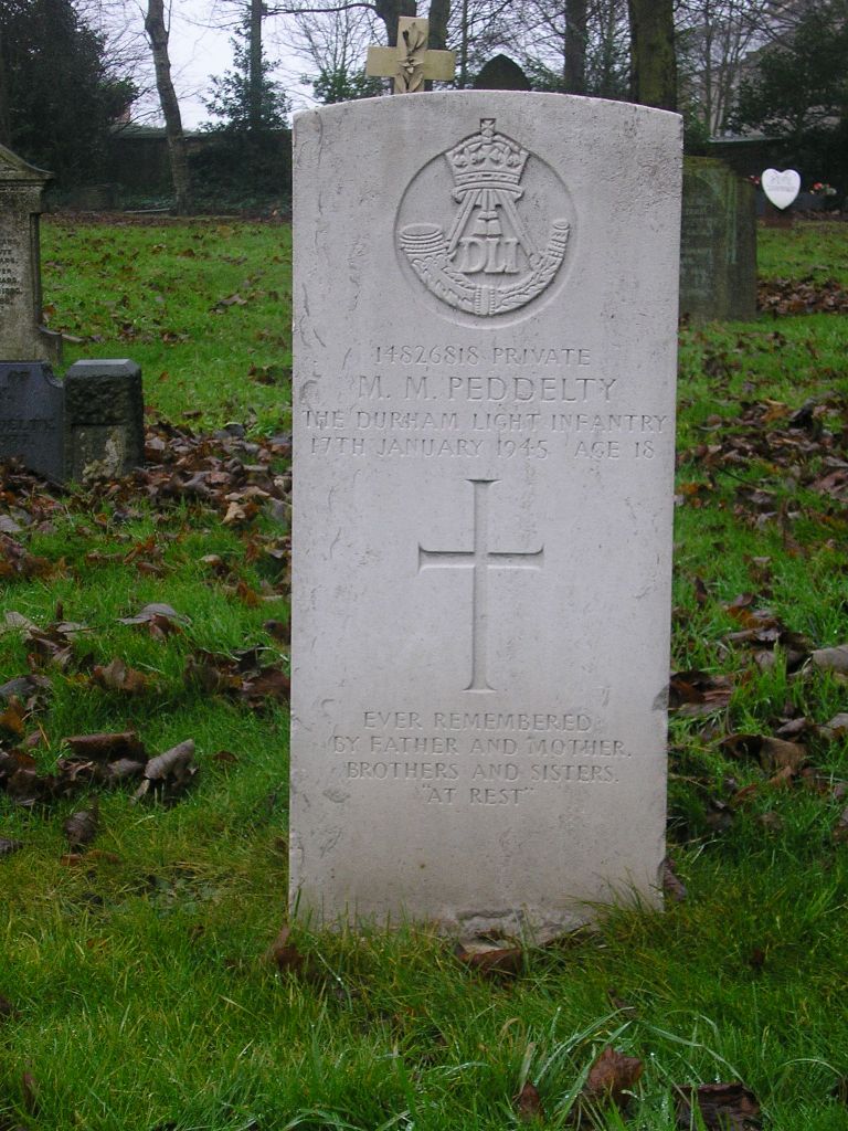 14826818 Private M.M. Peddelty, Durham Light Infantry drowned as a result of a training accident 17 January 1945 at Guyzance, Northumberland, aged 18.[1] He is buried in Evenwood Cemetery and commemorated on Evenwood War Memorial, the Book of Remembrance in the Church of St. Michael and All Angels, Felton, and the 2 Guyzance Memorials, Northumberland.[2]