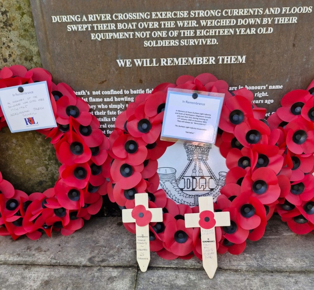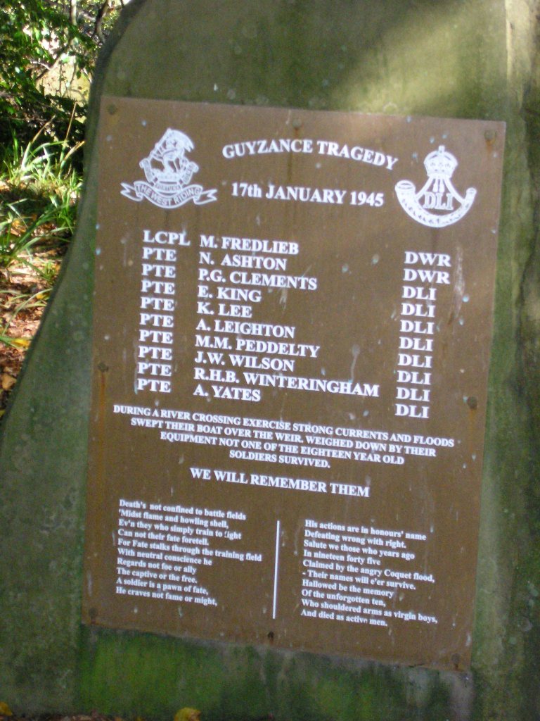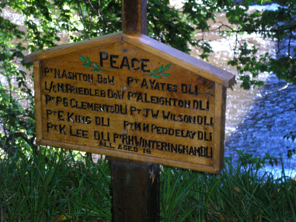 11 September 1995: A memorial to these ten young soldiers was erected adjacent to the weir by a number of people from Felton. The dedication ceremony was attended by a party from the DLI Association which had been organised by Bernard Seyburn of the Darlington and Newton Aycliffe Branch, who himself had completed the same course shortly before this unfortunate incident.