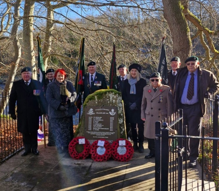On 7th June members of the Darlington & Newton Aycliffe branch as well as others of the DLI Association met at Guyzance near Felton, Northumberland to dedicate a new memorial to the young soldiers who lost their lives on the River Coquet at Guyzance in January 1945, training for river crossings in the final stages of World War 2, when their boat was swept over the weir and they, weighed down with full equipment, were drowned.
