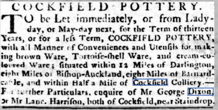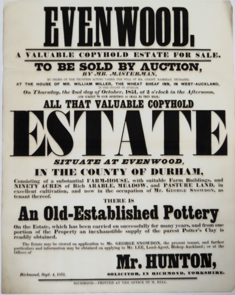“Bishop Auckland: New Moor Pottery, at Evenwood, carried on by Mr. George Snowdon for the manufacture of brown ware.”